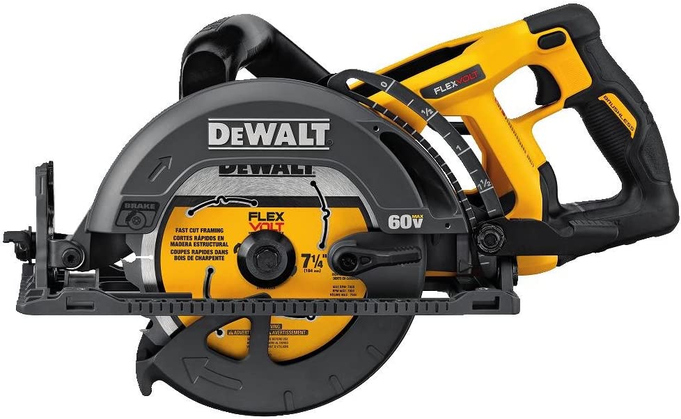 The FLEXVOLT 60V MAX* 7-1/4-inch Cordless Worm Drive Style Saw features a blade oriented to the left of the motor and the handle positioned at the rear of the saw to optimize line of sight when cutting. An electronic brake helps stop the blade after the trigger is released. Bevel capacity is 53-degree with stops at 45 degree and 22.5 degree. The saw achieves smooth, accurate cuts and long runtime with a durable, high-grade magnesium shoe and an efficient brushless motor. This Cordless Worm Drive Style Saw achieves 2-7/16-inch depth of cut at 90-degree. Hang the tool conveniently with the included rafter hook. This tool is also Tool Connect Tag-Ready so you can easily track it by attaching a Tool Connect Tag (Tag sold separately.) DEWALT FLEXVOLT Circular Saw is ideal for use in a variety of wood cutting applications such as oriented strand board (OSB), plywood, hardwoods, dimensional lumber, and flooring. Many of the professional contractors using this tool include framers, concrete formers, carpenters, and general contractors. DEWALT high powered cordless tools come standard with a 3-year limited warranty, 1-year free service contract and 90-day money-back guarantee. Purchase FLEXVOLT 20V/60V MAX* batteries separately.